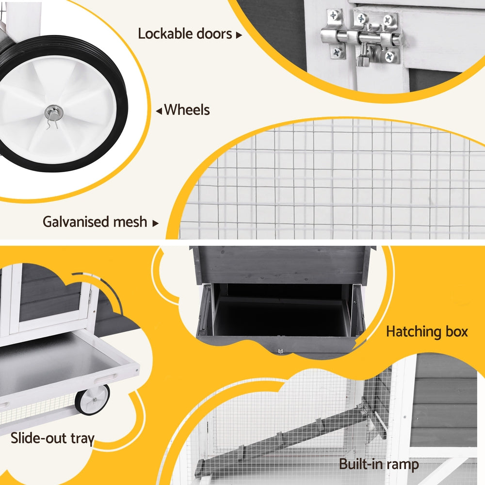 Description:The Chicken Coop, designed with a hatching box for easy egg collection and two wheels for portability, offers a secure...