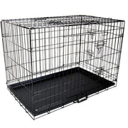 Featuring a foldable design with triple access doors, this dog cage offers maximum convenience and is extremely safe for containing your pets. It's metal constructed with a powder coated finish enhancing durability and is also rust resistant. Easy to setup, store, transport and clean. Great for securely keeping your pets contained, a must have for every pet owner.