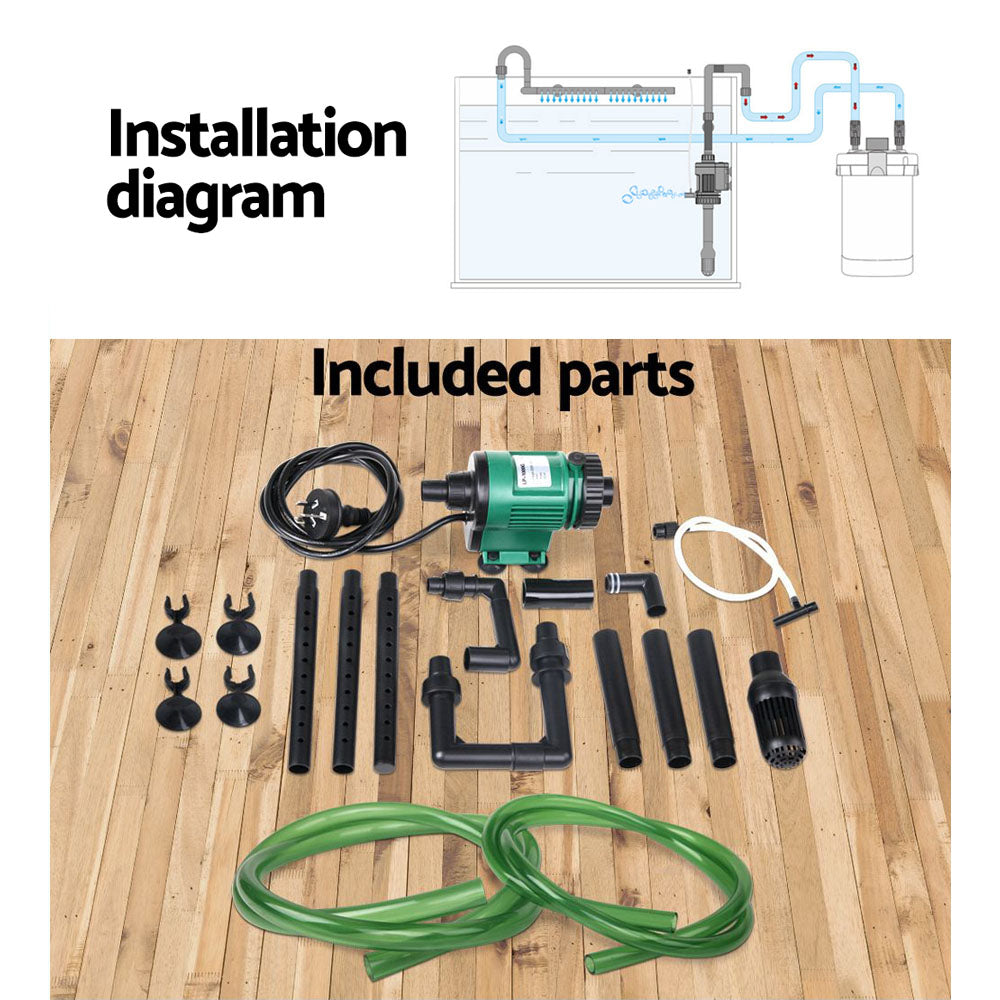 Use a multi-level approach to filtration and filter your tank water with our Aquarium Filter and Pump. This external filter is designed to be positioned outside of the tank and draw water into the filter through an inlet tube and return the water via an outlet tube. Suitable for both freshwater and saltwater aquariums sized up to 250 litres, this type of external filter avoids the need for an unsightly filter inside the tank. It runs on 14W power for energy-efficient operation and has a flow rate of up to 1250L/h. The 4-level stackable filter design means you can create a filtration system to suit your needs, by using all or some tiers and filling with your preferred media (media not included). Designed with a tight cap lock with no need to worry about leaks and coming with a full set of accessories, it is very easy to set up without any specialised tools required. Once you start filtering your tank, you will begin to see clearer and purer waters and be able to take active control over your water characteristics.