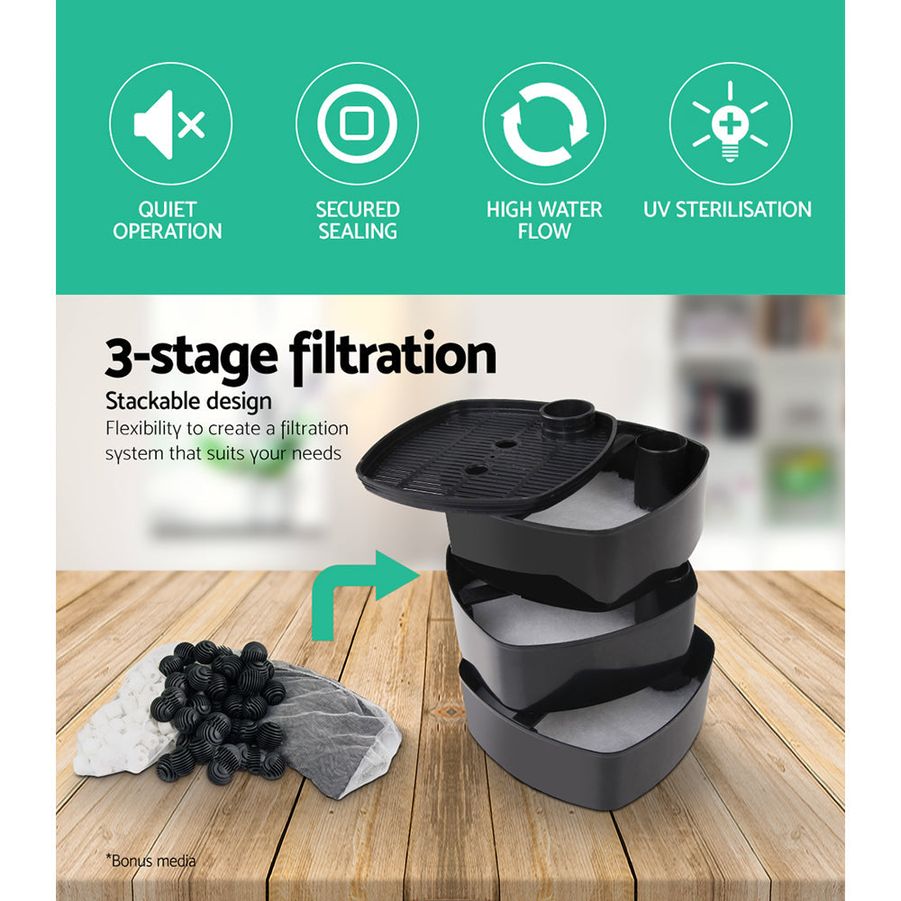 The 3-level stackable filter design means you can create a filtration system to suit your needs, by using all or some tiers and filling with your preferred media (bonus media included). Designed with a tight cap lock with no need to worry about leaks and coming with a full set of accessories, it is very easy to set up without any specialised tools required.